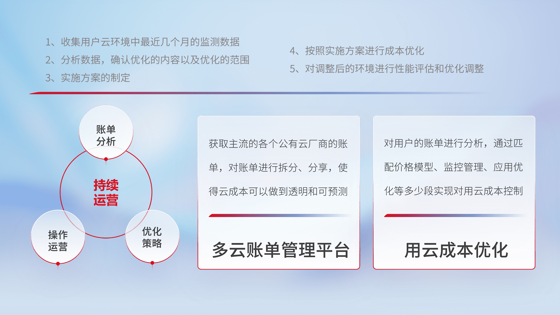 通过多云纳管,,,以统一的资源数据模型把客户的云资源进行抽象和封装,,进而实现对多云资源的统一操作,,,,保障云资源管理的可靠性、、、、稳定性与可用性。。量身定制化运维内容,,配置、、开发运维、、补丁管理、、、、备份、、、、监控、、、认证和访问管理、、、审计和日常巡检等,,,,保障在用云过程中的可靠度,,,,稳定度以及高可用率。。。